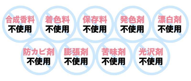 合成香料・合成着色料・合成保存料・発色剤・漂白剤・防かび剤・膨張剤・苦味料・光沢剤といった9種類の添加物を不使用!