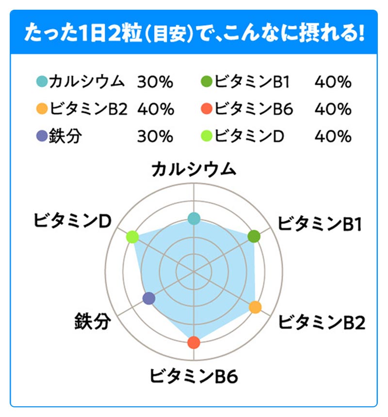 | 1日の目安量 | 2粒 | 2粒 | 2粒 | 1杯 | 6粒 |